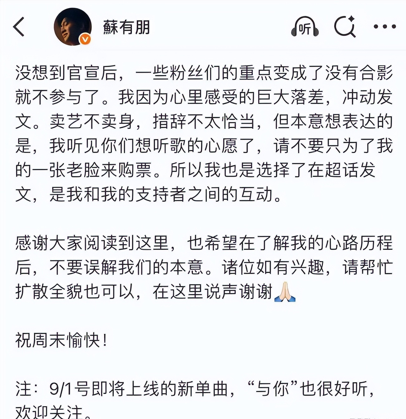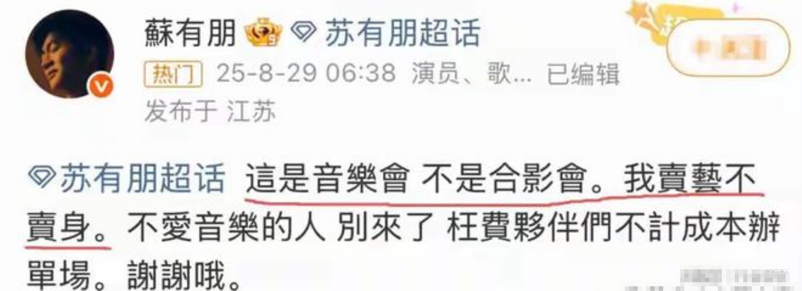 这种差异化服务本来也不算什么新鲜事,毕竟演艺圈里价格分层早就是常规操作。但问题出在后续的处理上。由于VIP票数量有限,很多粉丝抢不到,就只能退而求其次买普通票。有粉丝礼貌地建议能否开放普通票的合影权益,结果苏有朋在8月28日直接在社交媒体上怒怼:"这是音乐会,不是合影会。我卖艺不卖身。不爱音乐的人别来了,枉费伙伴们不计成本办单场。谢谢哦。"