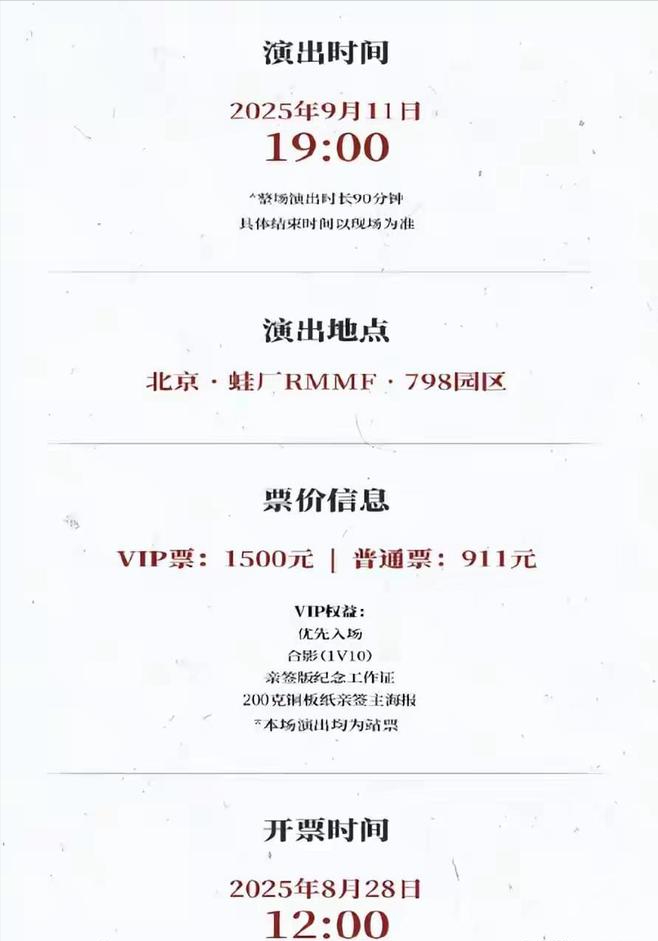 2025年9月11日,也就是他52岁生日当天,这位前小虎队成员要在北京搞一场"B-Side限定音乐会"。听起来挺文艺的,实际操作起来却让人大跌眼镜。门票分两档:VIP票1500元人民币,普通票911元。VIP的可以享受1对10合影、亲签海报、优先入场等福利,普通票的就只能站着看演出,连张合影都别想。