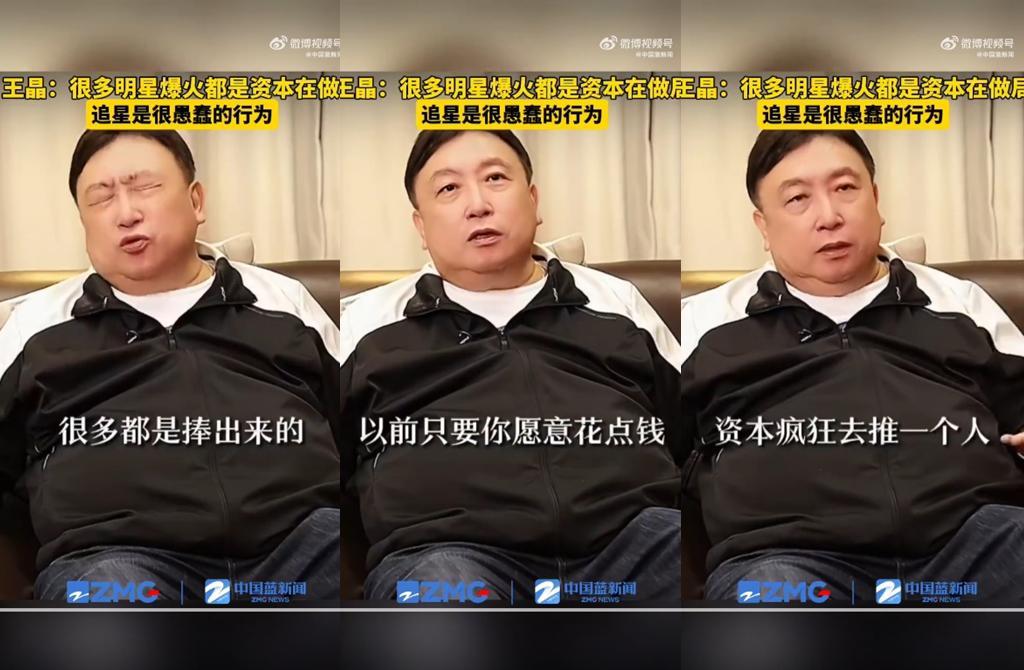 王晶在接受访谈时直言不讳地指出:"很多明星都是通过资本捧出来的""你看的一切美好,都是明星想让你看的,有些明星真正的样子比路人还差"。他还特别提到:"追星根本就是一个很愚蠢的行为,甚至连分辨好坏的能力都没有。"